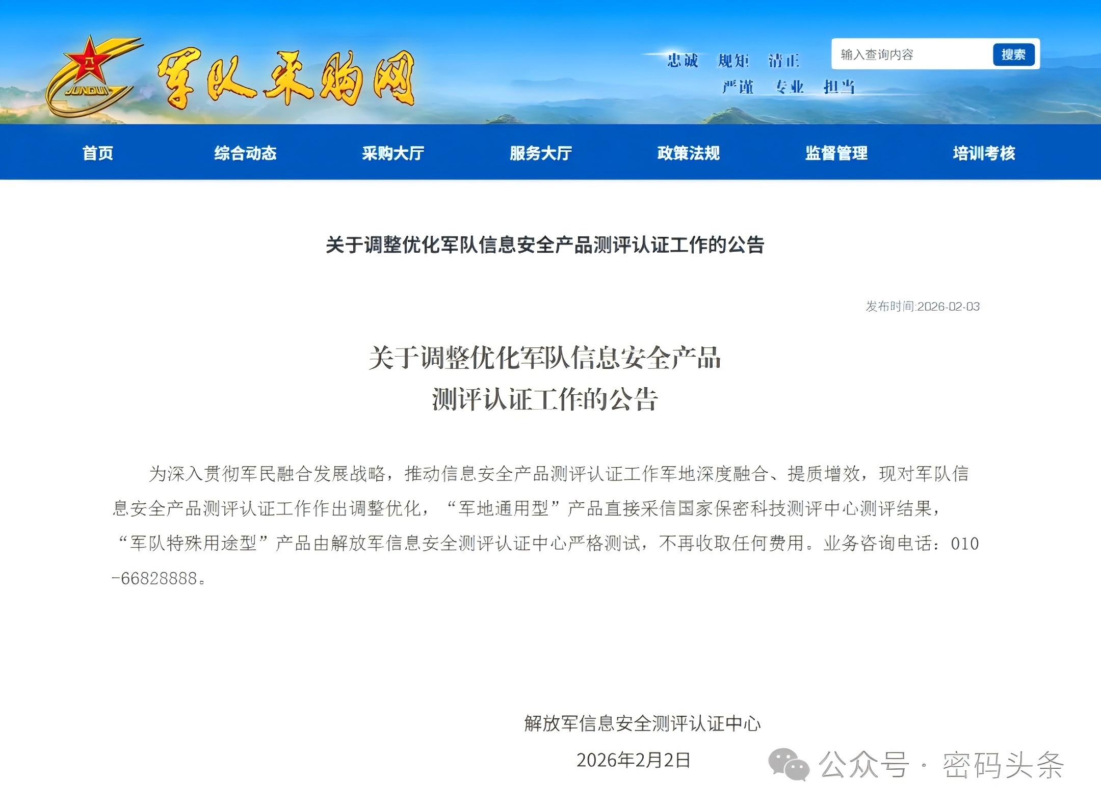 2026年2月3日,军队采购网发文,为深入贯彻军民融合发展战略,推动信息安全产品测评认证工作军地深度融合、提质增效,现对军队信息安全产品测评认证工作作出调整优化,“军地通用型”产品直接采信国家保密科技测评中心测评结果,“军队特殊用途型”产品由解放军信息安全测评认证中心严格测试,不再收取任何费用。